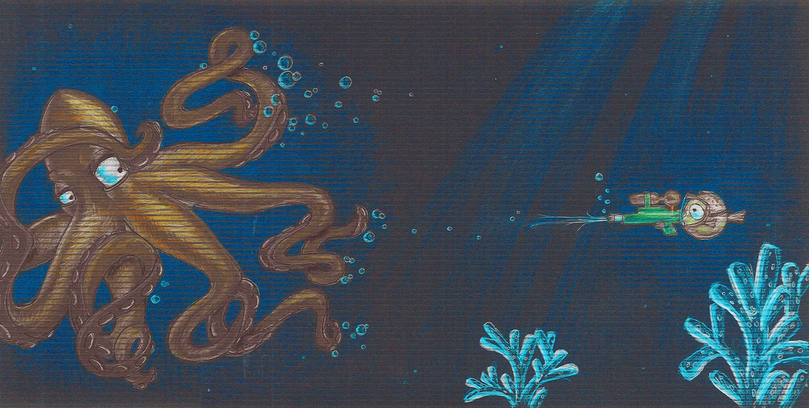 Ok.... so the title is a groaner and could use some help, but here's a little colored pencil/sharpie drawing I threw together for an art swap we did here at work. I was in the mood to do something semi-colorful on a nice dark deep colored paper and this is what it evolved into. I love very organic twisty imagery and octopus legs just sort of formed from my squiggles as I was planning it out. Before I knew it I had a very terrified looking octopus and ended up adding the little fishy as his aggressor. The paper was textured, so I decided to work with it and see what kind of result I could get using the textured side. I couldn't quite get the colors of this scan representative of the original, but oh well, close enough.Everyone who participated in our art swap brought in a piece of art. There was a ton of variety from quilts, to photography, to paintings, to re-purposed ready made art, to quick character sketches. We all drew numbers and swapped based on what we drew. It was a lot of fun, I ended up with a very cool "burner" that vishal did , and vivek got this piece